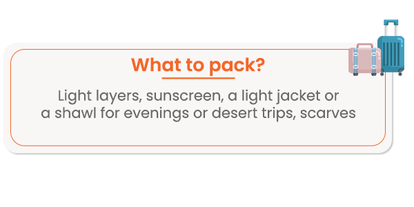 - Cultural Sightseeing: Modest wear — long-sleeve cotton shirt, light trousers, shawl